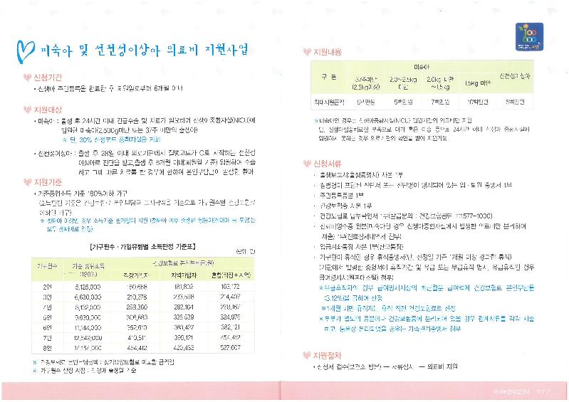 지원대상은 ‘임신 37주 미만 또는 2,500g미만으로 출생한 후 24시간 이내 긴급수술 및 치료가 필요해 신생아중환자실에 입원한 미숙아’와 ‘출생 후 28일 이내 의료기관에서 선천성이상(질병코드Q)으로 진단받고 출생 후 6개월 이내(퇴원일 기준) 입원해 수술하고 그에 따른 치료를 받은 선천성이상아’다.