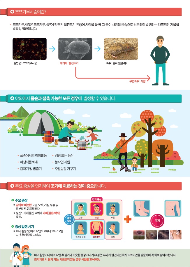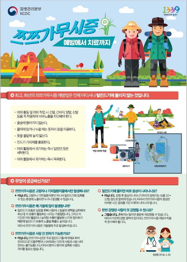 진드기에 물렸을 경우 걸릴 수 있는 감염병으로는 ▲쯔쯔가무시병, ▲라임병, ▲SFTS(중증열성혈소판감소증후군), ▲진드기매개 뇌염 등이다. 캠핑 또는 등산, 야생식물 채취 등 야외에서 풀숲과 접촉가능한 모든 경우에 발생할 수 있다.