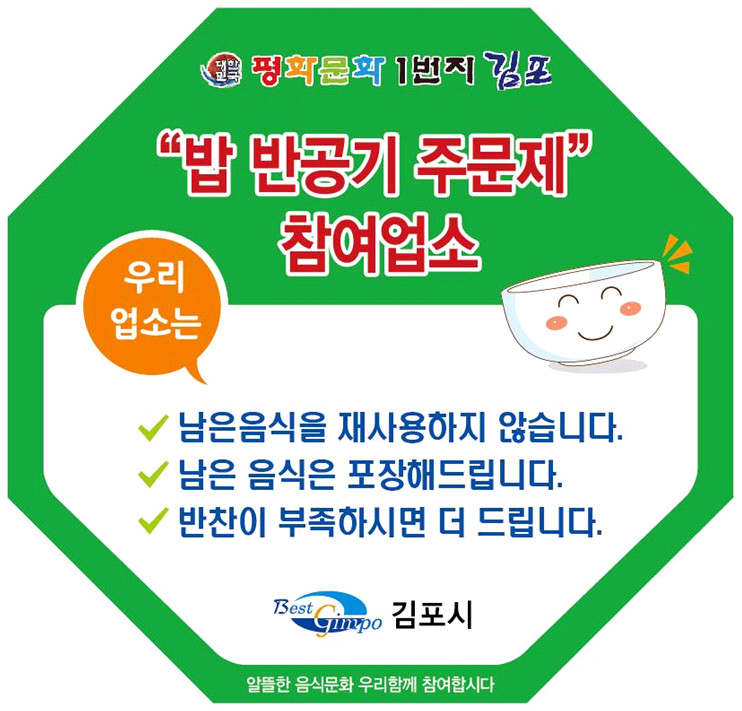 밥 반공기 주문제는 음식점에서 제공되는 공기밥을 개인의 식사량에 따라 먹을만큼만 주문하는 것으로 김포시는 2011년 첫 시행해 영업주와 시민의 호응속에 현재 90개 음식점이 참여하고 있다.