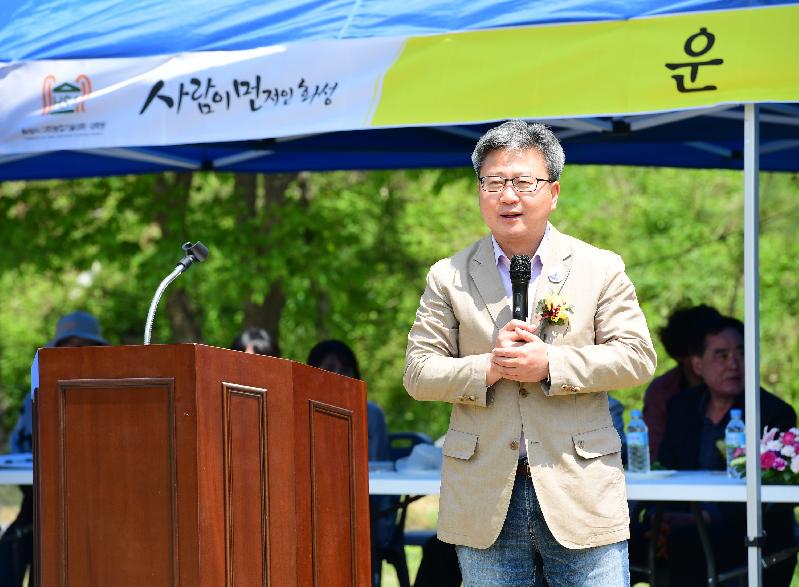 | 그린농업대학 체육대회에서 채인석 화성시장의 인사모습.<사진=화성시청 제공> |