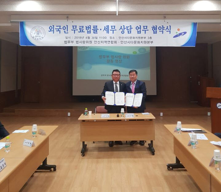 안산시 다문화지원본부(본부장 이장원)와 법무부 법사랑위원 외국인위원협의회(위원장 이동전)가 지난달 30일 외국인 법률·세무 상담 지원을 위한 업무협약을 체결했다.