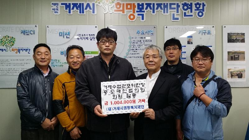 거제수협 관포위판장 중‧도매인 협의회(회장 박대진)는 지난 18일, 일백만사천원을 (재)거제시희망복지재단(이사장 박동철)에 전달하여 행복천사 27호가 되었다.