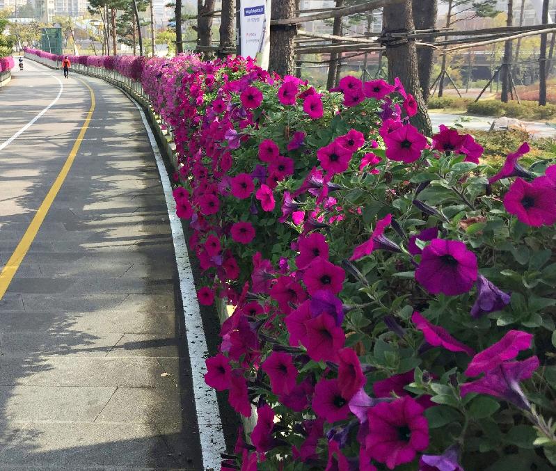 인근 초등학생들의 통학로 역할을 하고 있는 신대호수 교량데크와 원천호수 수변데크 산책로는 웨이브페추니아 등 아래로 늘어지며 자라는 초화류가 장식한다. ‘입체감 있는 볼륨원’이다.