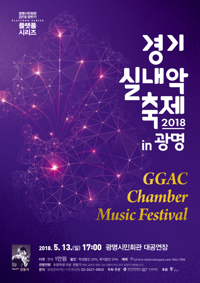 5월 13일(일)에는 예술감독 강동석과 국내 정상급 아티스트들이 함께하는 <2018 경기실내악축제 in 광명> 공연이 개최된다. 경기도문화의전당과 공동 기획으로 진행되는 이번 공연은 한국 첼리스트의 자존심인 양성원, 한국예술종합학교 출신의 젊은 연주자들로 구성된 국내 대표 실내악팀 노부스 콰르텟(Novus Quartet)이 출연하며, 클래식 음악의 가장 정점을 이루는 연주자들의 연주와 해설이 함께한다.