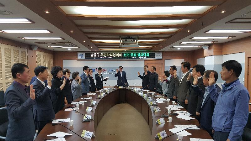 인천시 남동구 주민자치협의회(회장 한동길)가 3일 남동구청에서 5월 중 월례회의를 갖고, 제7회 전국동시지방선거와 관련해 ‘선거 중립 결의대회’를 개최했다.