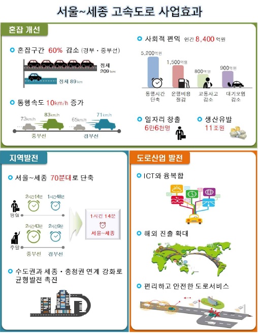국토부는 “서울~세종 고속도로 사업이 추진되면 그간 주말은 물론 주중에도 만성적인 교통정체가 발생하고 있는 경부·중부고속도로의 혼잡구간이 60% 정도 감소할 것으로 예상된다”고 말했다.