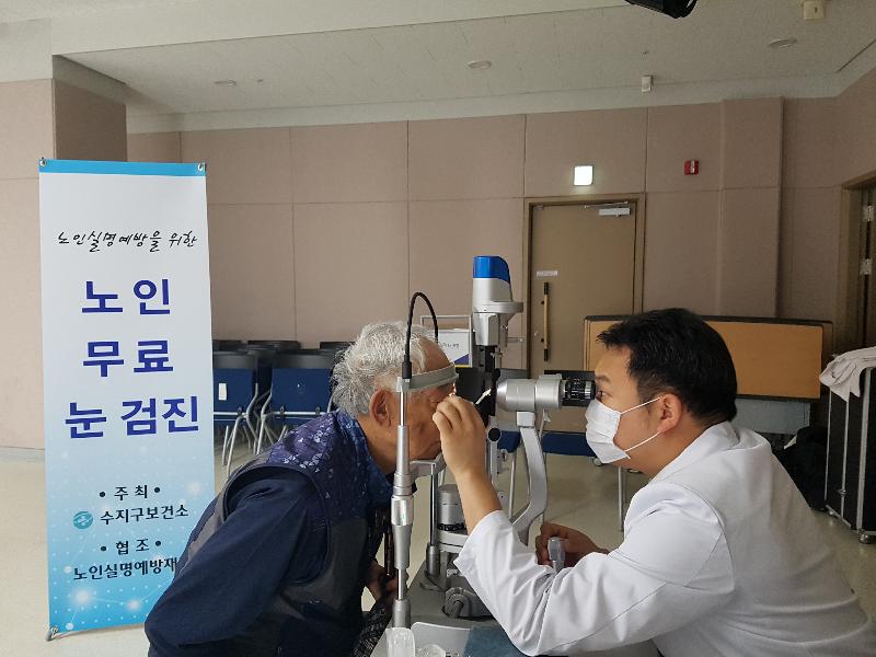 수지구보건소가 노인실명예방재단 검진팀과 함께 문진과 시력 및 안압검사, 굴절검사, 현미경 검사, 진료 등을 했다.