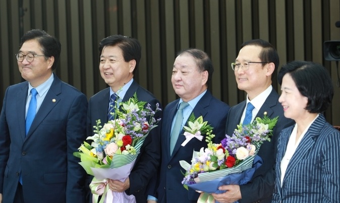 더불어민주당은 11일 오전 국회에서 의원총회를 갖고 원내대표 경선을 실시한 결과 홍 의원이 투표수 116표 중 78표를 얻어 38표를 얻은 노웅래 후보를 제치고 신임 원내대표에 선출됐다.