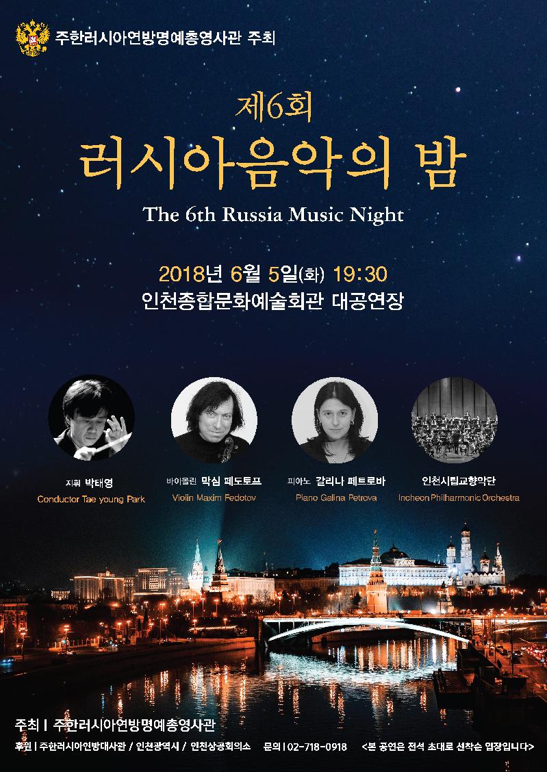 올해로 6회째를 맞이한 “러시아음악의 밤”은 인천을 중심으로 한 국제적 수준의 음악회로서 사할린 영주 귀국동포 및 다문화 가정, 독거노인, 그리고 일반인을 대상으로 하여 매년 전석 무료 초청 공연을 주한 러시아연방 명예총영사관이 마련하고 있다.
