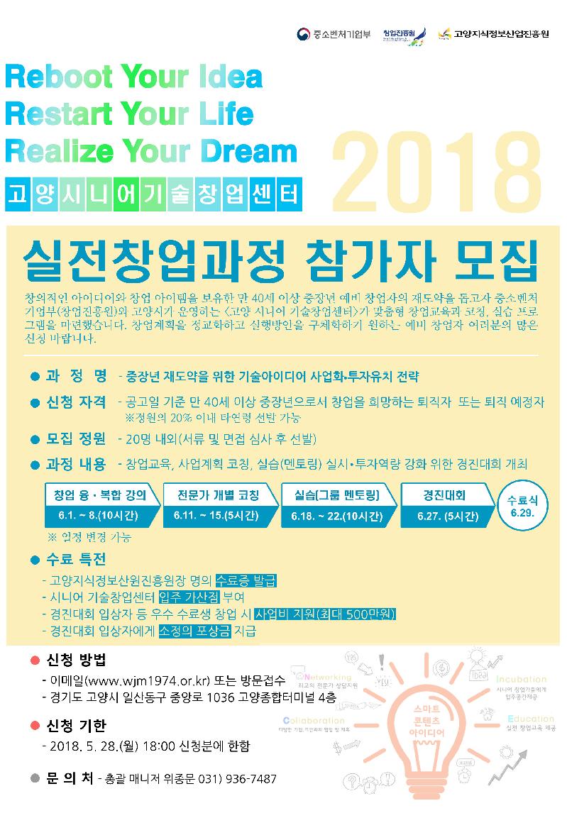 중소벤처기업부(창업진흥원)와 고양시가 운영하는 고양 시니어 기술창업센터는 ‘2018년도 실전창업과정(중장년 재도약을 위한 기술 아이디어 사업화·투자유치 전략)’ 참가자를 모집한다.