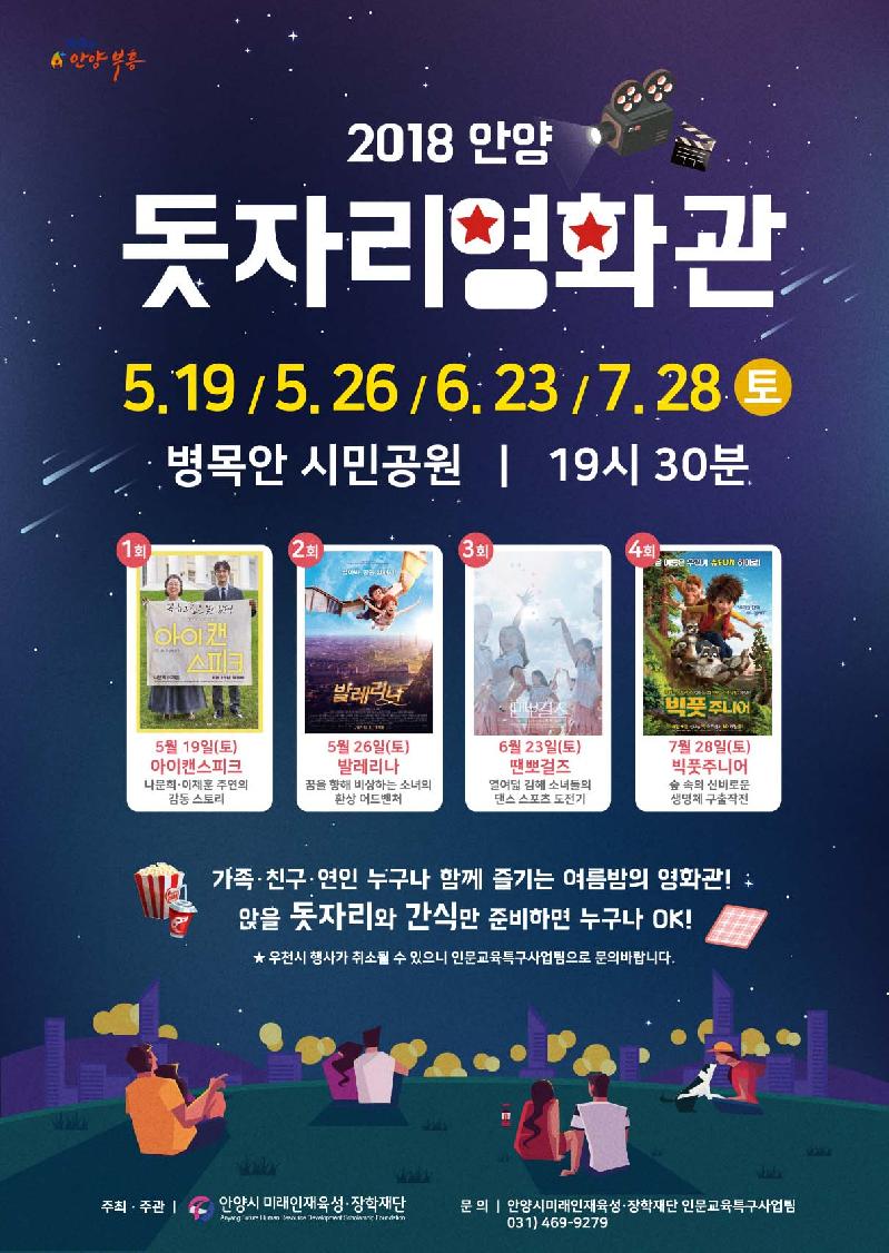 안양시미래인재육성·장학재단은 오는 19일(토) 저녁 7시 30분에 병목안시민공원에서 돗자리 영화관 행사를 개최한다.