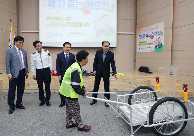 평택시는 14일 팽성읍사무소 대회의실에서 새벽이나 늦은 저녁, 식별이 어려운 시간대에 거리에서 폐지를 줍는 관내 어르신 153명에게 초경량 주문제작 손수레, 손수레 후미등, 빛반사 바람막이 점퍼, 내복, 야광조끼, 안전장갑 등 11종 579점의 교통안전 및 작업안전 용품 지원과 함께『찾아 가는 교통안전 교육』을 실시했다.
