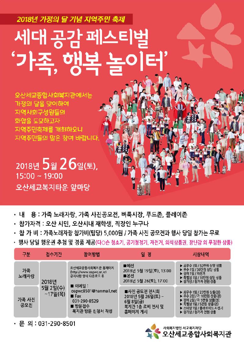 이번 지역주민축제 세대공감 페스티벌 ‘가족, 행복 놀이터’는 오산시민과 학생, 직장인 등을 대상으로 진행하며, 오산지역 구성원들이 서로 화합하고 가족의 소중함을 느낄 수 있는 기회 제공을 위해 마련되었다.