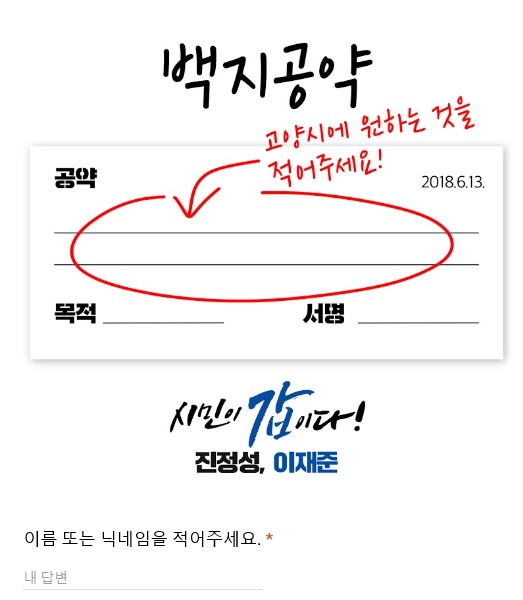 ‘이재준의 백지공약’은 고양시민의 다양한 의견을 공약에 반영하기 위해 지난 11일(금)부터 실시되고 있으며, 고양시민이면 누구나 아래 링크를 통해 참여할 수 있다.