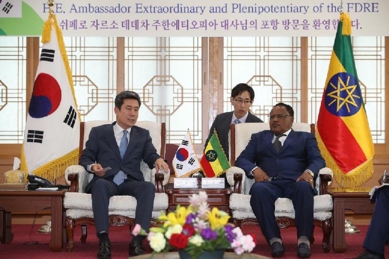 포항시가 최근 연이은 투자유치 성공에 이어 지역 기업들의 해외 진출에도 관심을 가져 눈길을 끌고 있다. 14일, 포항 소재 기업을 대상으로 자국의 투자유치 설명을 위해 쉬페로 자르소(Shiferaw jarso) 주한 에티오피아 대사 일행이 포항을 방문했다. 이날 설명회는 한동R&C그룹 등 이노비즈 회원사 지역 우수 8개 기업이 참여한 가운데 에티오피아의 투자 인센티브와 우리기업들은 우수한 기술력을 알리는데 주력하는 등 시종일관 진지한 분위기 속에서 설명회가 진행되었다. 에티오피아의 주된 산업은 커피, 화훼 등 아직까지 농업의 비중이 크지만 차츰 산업화로 전환되면서 도로 등 기반시설, 기계가공 및 자동화 설비, 인터넷 정보서비스, 폐수처리 등 환경 분야 등에서도 우리 기업들의 진출이 기대된다. 인구가 1억명 가까이 되고, 국토 면적이 한반도의 5배가 되는 인적 물적 자원이 풍부한 에티오피아는 최근 들어 아프리카 국가 중 경제 발전 속도가 매우 높은 편으로 무한한 가능성을 잠재하고 있다. 특히, 에티오피아는 6.25 한국전쟁 당시 아프리카에서는 유일하게 6,000명이라는 대규모 지상군을 파견하였고, 이후 한국을 경제 개발의 모델로 삼는 등 우리나라와는 전통적인 우호관계를 유지하고 있다. 이번에 에티오피아에 투자유치를 위해 포항을 방문한 쉬페르 자르소 대사는 자국에서 농업 전공 관련 대학을 졸업하고 영국에서 토양, 물공학을 공부한 재원으로, 지난 2016년 기계면 문성리 새마을운동 발상지 기념관과 포항시 농업기술센터 등 네 차례나 방문할 만큼 포항에 대해 관심이 높다. 한국 기업 투자유치를 위해 포항시청을 방문한 대사 일행은 설명회를 마치고 이강덕 시장과 환담을 가졌다. 이 자리에서 이 시장은 에티오피아는 앞으로 발전 가능성이 무궁무진한 나라라면서 “포항지역은 세계 최고 철강사와 건설, SOC 분야 등에 우수한 기업들이 많은 만큼 포항지역 기업들이 보다 나은 조건으로 에티오피아에 진출할 수 있도록 쉬페로 자르소 대사의 역량을 기대한다”며, “포항시에서도 해외 수출 및 해외 진출 지역기업에 대한 지원 방안을 적극 검토해 시행하겠다.”고 말했다.배수남 기자 najomba2279@daum.net
