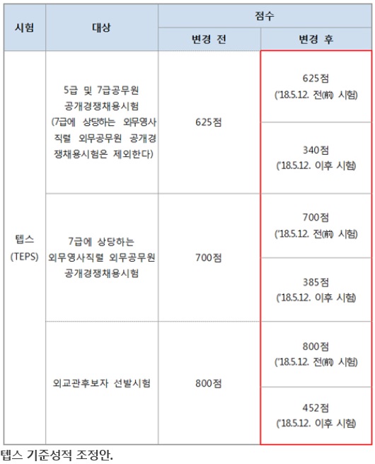 국가직 공무원시험에서 영어시험을 대체하는 텝스(TEPS)의 기준점수가 변경된다.