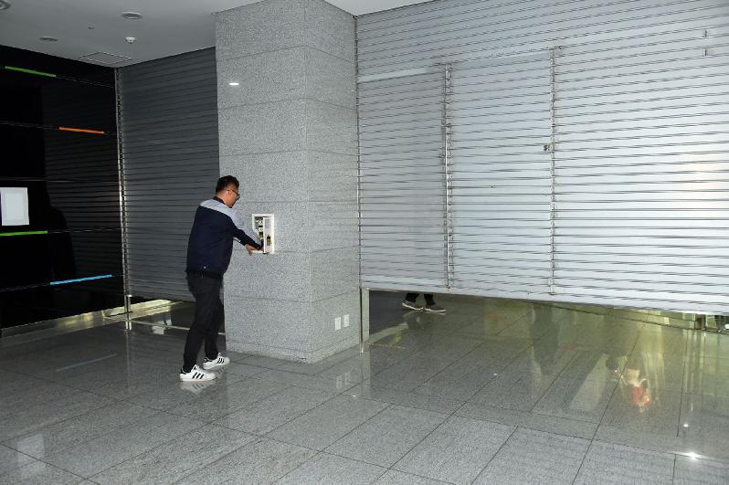 | 지난 11일 사전예고 없이 실시한 성남시청사 화재 발생 대피 훈련 때 방화벽 차단. |