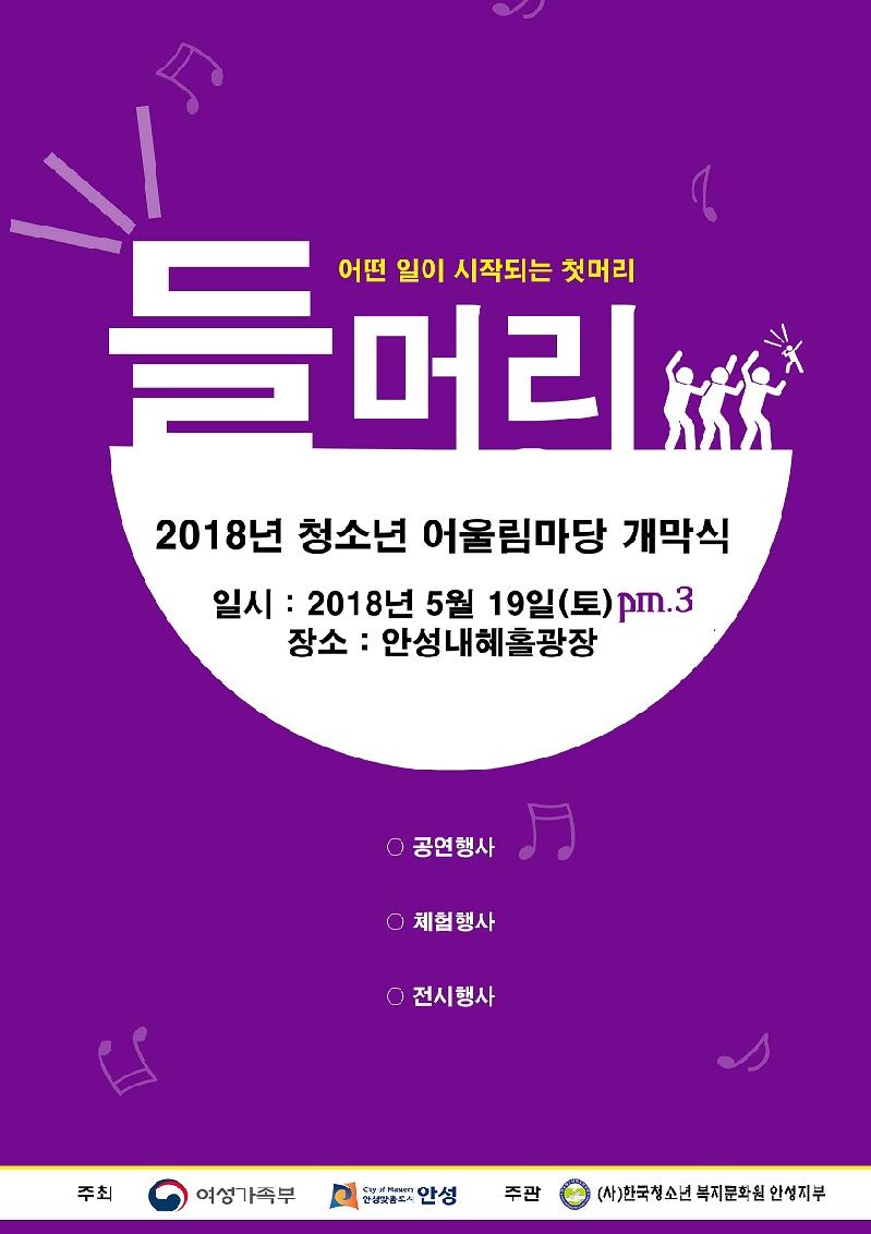 안성시와 여성가족부가 주최하고 (사)한국청소년복지문화원 안성지부가 주관하는 ‘2018 안성시 청소년어울림마당 개막식’은 문화, 예술, 스포츠 등을 소재로 한 공연, 전시, 놀이 등 문화 체험이 펼쳐지는 장으로 청소년들이 주체적으로 활동하는 축제의 한마당으로 펼쳐진다.