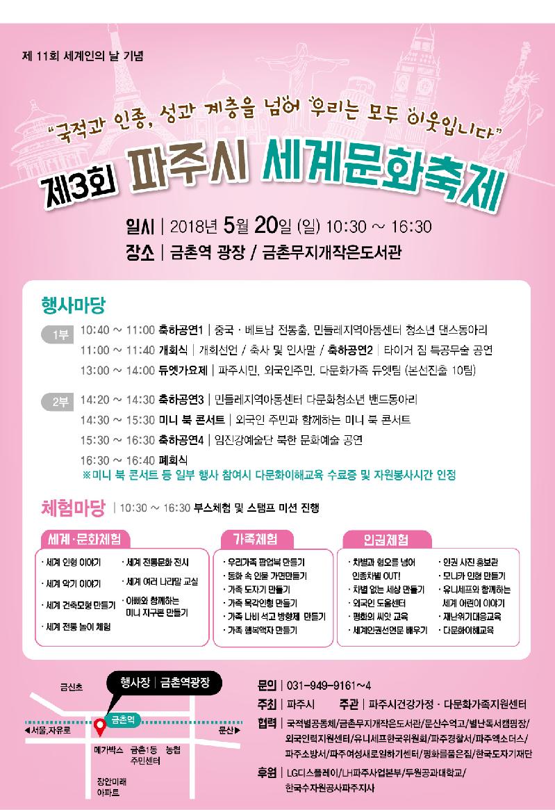 파주시는 오는 20일(일) 세계인의 날을 기념해 내․외국인간의 소통과 화합의 장을 마련하고자 제3회 파주시세계문화축제를 금촌역 광장에서 개최한다.