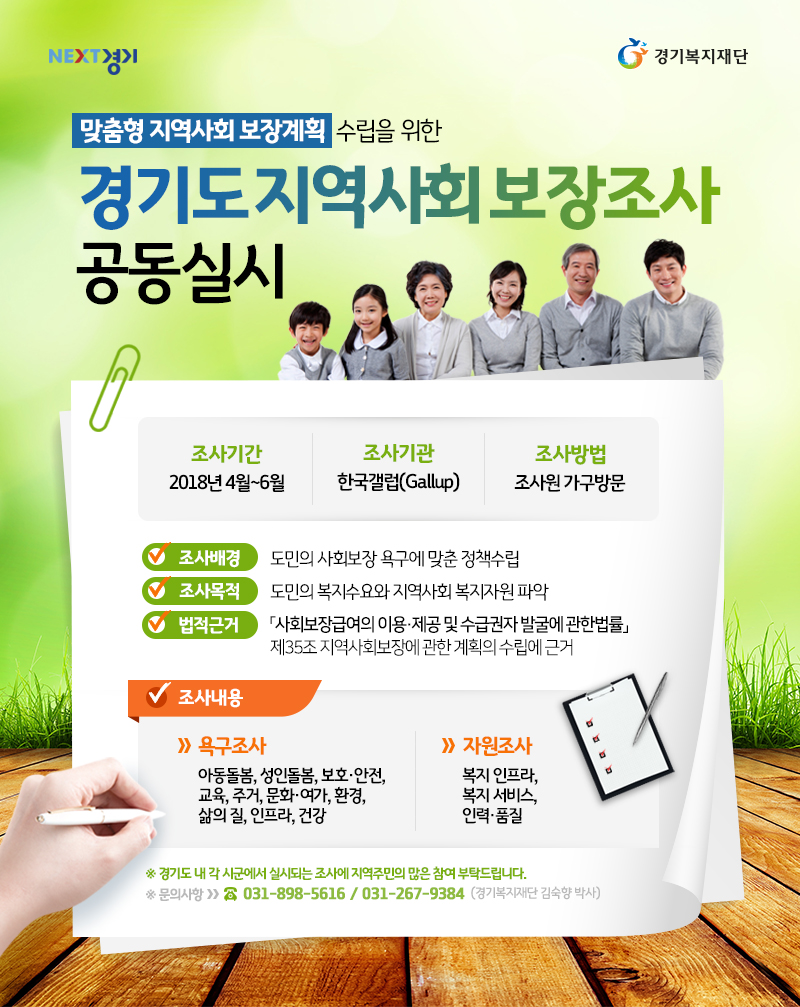 조사내용은 보건복지부가 제시한 욕구조사(아동돌봄, 성인돌봄, 보호안전, 교육, 주거, 문화여가, 환경, 삶의 질, 인프라, 건강) 및 자원조사(복지 인프라, 복지서비스, 인력품질)이며, 전문조사원이 개별 방문해 200여개 항목에 대한 면접 설문조사 방식으로 진행된다.