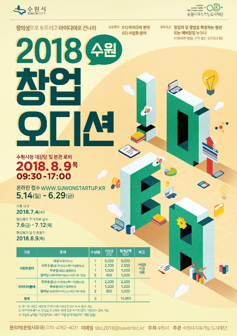 수원시지속가능도시재단이 주관하는 수원 창업 오디션은 성장잠재력이 있는 예비창업자와 우수 아이템·기술력을 보유한 창업기업을 발굴하는 대회다. 수상자에게는 창업·사업화 자금, 인센티브를 제공한다.