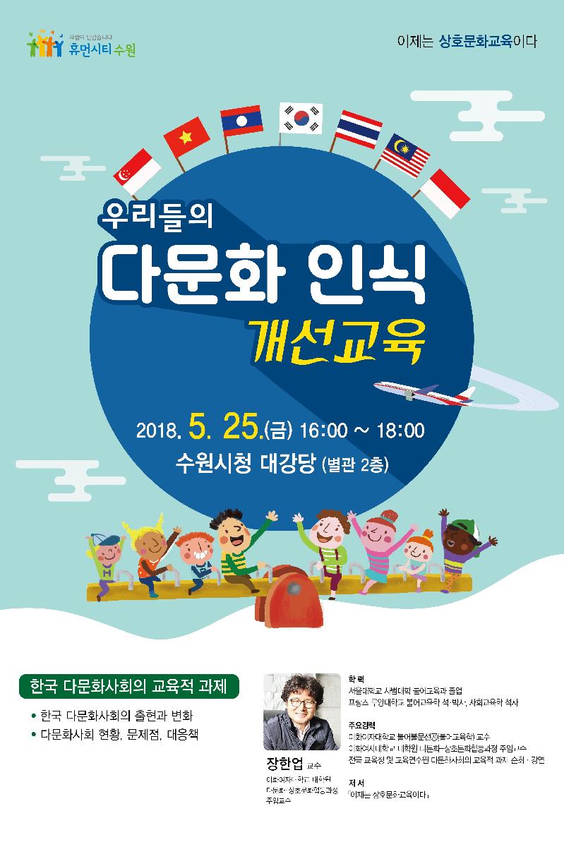 수원시는 오는 25일 오후 4시 수원시청 대강당에서 본격적인 다문화시대를 맞아 우리 교육의 문제점과 나아갈 방향을 제시하고, 다문화사회에 대한 올바른 가치관을 정립해줄 공개 강연회를 연다.