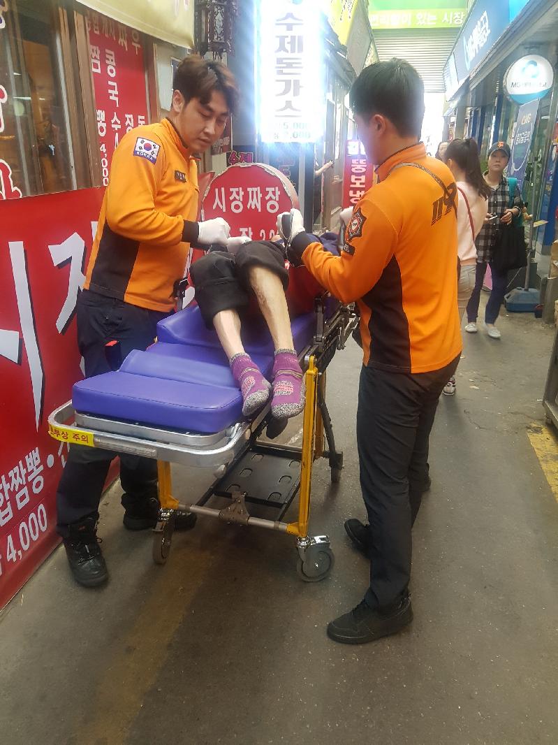 | 의식 잃은 자장면집 사장을 119대원이 옮기고 있다. |
