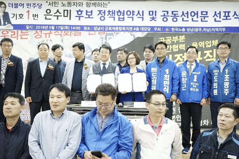 은수미 성남시장 예비후보가 17일 오후, 한국노총 성남지역지부와 공동선언을 발표하고, 「6.13 지방선거 승리 노동존중 정책연대 협약」을 체결했다.