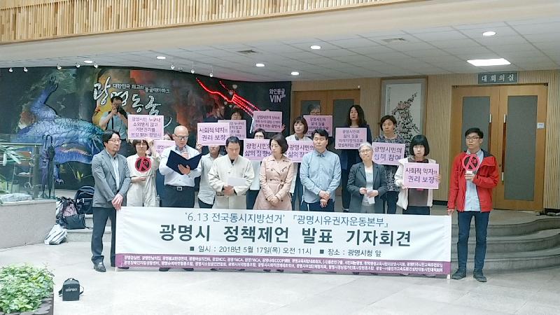 제7회 전국동시지방선거를 앞두고 광명시 21개의 시민사회 생협상인단체로 만들어진 『광명시유권자운동본부(이하 ‘본부’)』는 17일 오전 11시 광명시청 본관 1층 로비에서 광명시장에게 정책을 제언하는 기자회견을 가졌다.