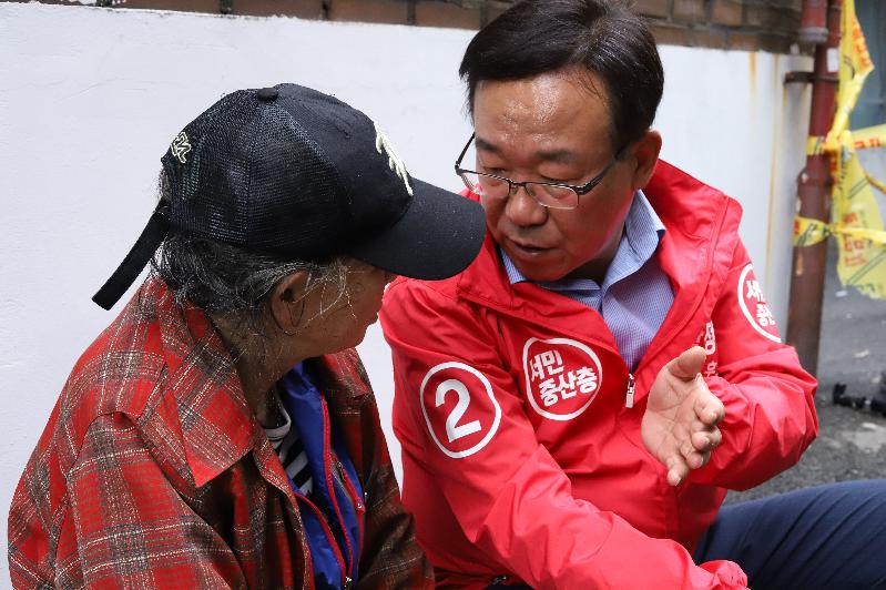 성남시장 선거에 출마한 자유한국당 박정오 후보는 17일 오전 수정구 재개발 지역을 직접 답사하는 과정에서, 폭우로 1층 가정집 담벼락이 무너져 내린 사고현장을 발견하고 현장에서 직접 피해자를 만나 위로를 전했다.