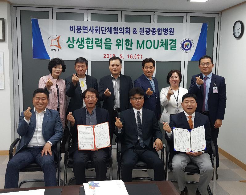 화성시 비봉면사회단체협의회와 원광종합병원(송산동 소재)이 주민들의 의료비 부담을 덜고 어르신들의 건강한 삶을 지원하고자 지난 16일 업무협약을 체결했다.