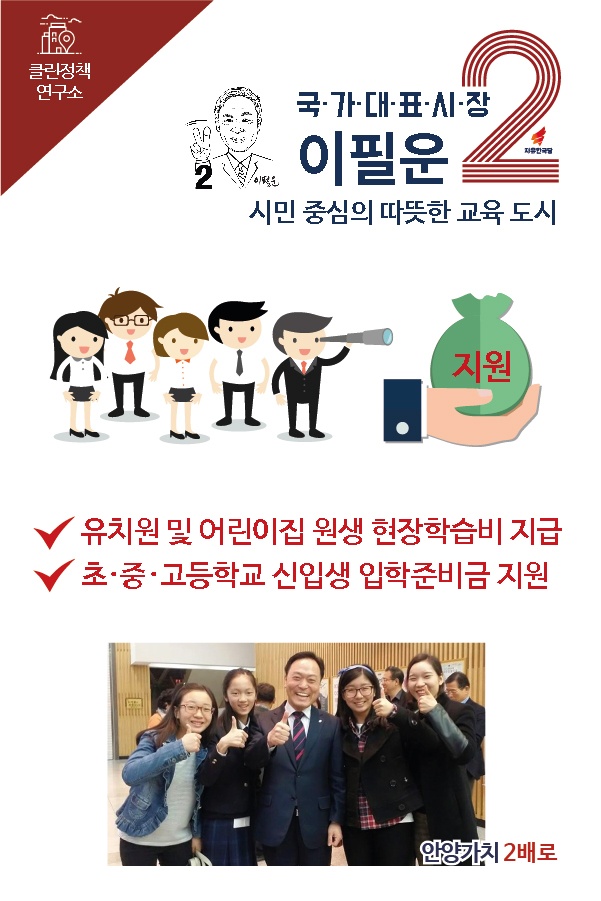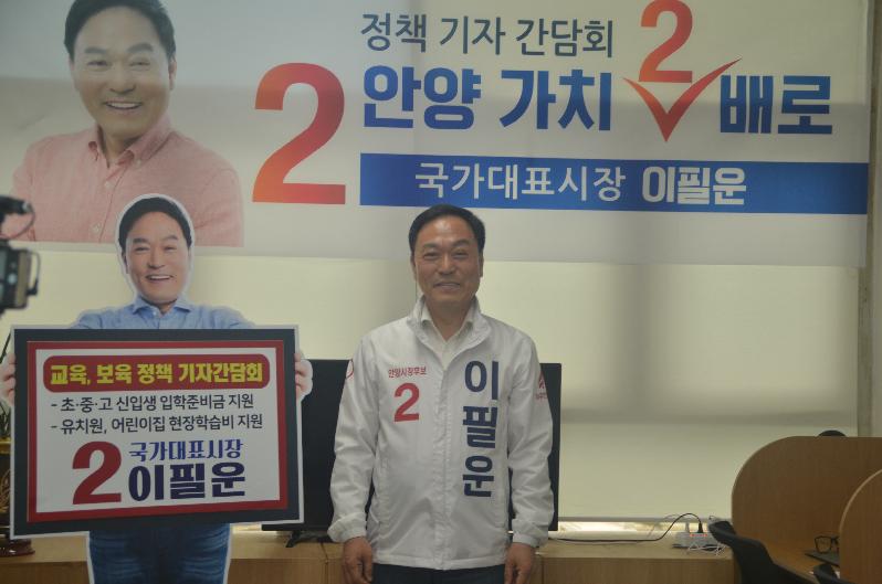 이필운 안양시장 후보는 그동안 중,고등학교 신입생 무상교복 · 고등학교 급식비를 지원하였고, 동아리 활동 지원, 프로그램 지원, 학교시설 개선 등 안양형 교육모델을 만들고 추진해 왔다. 그리고 전국 최초로 안양시가 인문교육특구로 지정되는 쾌거를 이루었다. 또한 전국 최초로 어린이집 준공영화를 시행하여 사회보육료 지원, 교사 인건비 지원 등을 시행하였고, 이를 통해 민간어린이집과 시립어린이집 사이의 보육 격차를 해소하는데 노력 했다고 자평했다.
