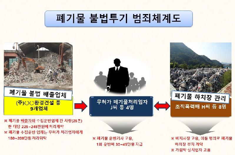 폐기물수집·운반업체 대표, 무허가 폐기물처리업자, 조직폭력배(8명)까지 결탁한 이들은 총괄책, 가림막 설치업자, 하치장 관리자, 운반기사, 바지사장, 문지기 등으로 각 역할을 철저히 분담해 범행했다.