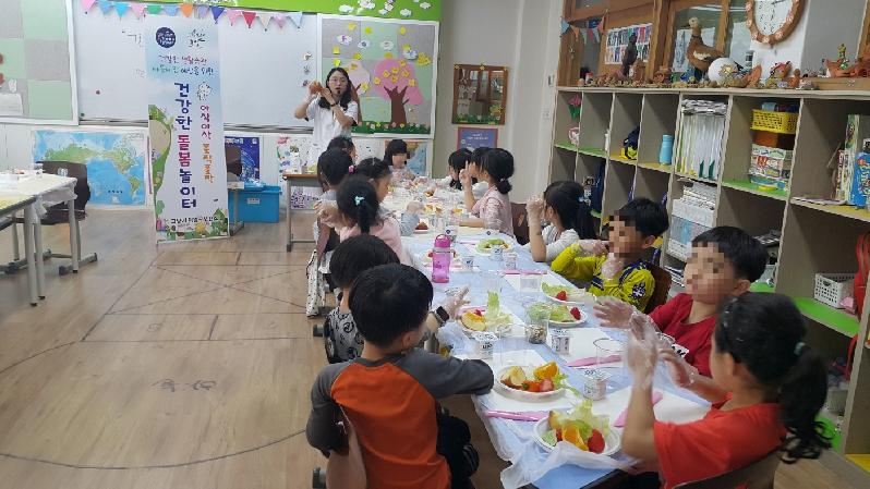 ‘건강한 돌봄놀이터는’ 보건소 영양사가 학교로 방문해 ▲세상에는 다양한 음식들이 있어요, ▲음료는 흰우유로 마셔요, ▲건강간식이 필요해요 등을 주제로 원물채소 및 과일을 활용한 체험형 영양 교육 및 ▲무궁화꽃이 피었습니다, ▲비석치기, ▲스케터볼, ▲도구를 이용한 릴레이 등 아이들 눈높이에 맞는 신체 활동 프로그램으로 이뤄져 있다.