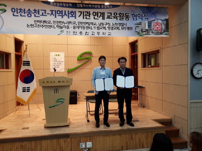 논현고잔동(동장 송진호)이 18일 인천 송천고등학교(교장 손근섭)와 지역 주민들의 삶의 질 향상과 송천고 학생들의 봉사 정신 함양을 위한 업무 협약을 체결했다.