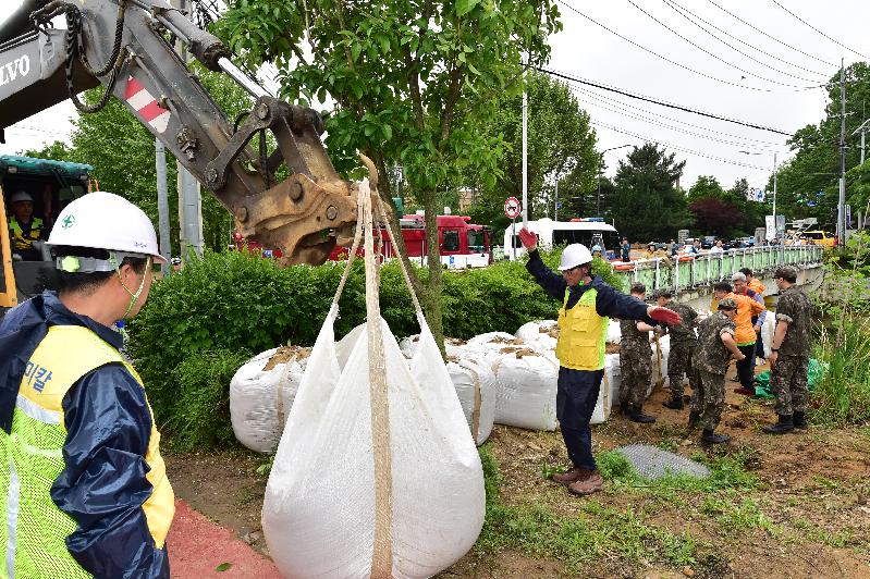 | 풍수해 대비 훈련(모래자루를 쌓는 모습).사진=수원시청 제공> |