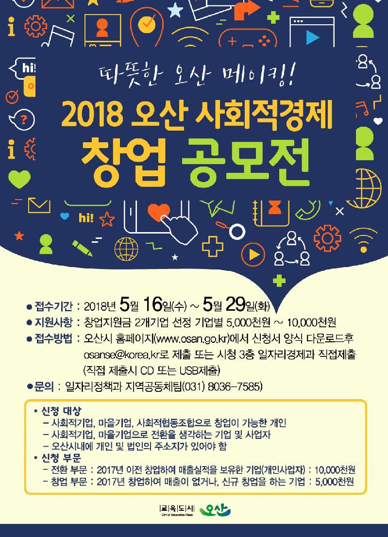 오산시는 지역의 문제를 해결하고 일자리를 창출하는 사회적경제 창업 지원을 위해 ‘2018 오산 사회적경제 창업 공모전’을 개최한다고 밝혔다.