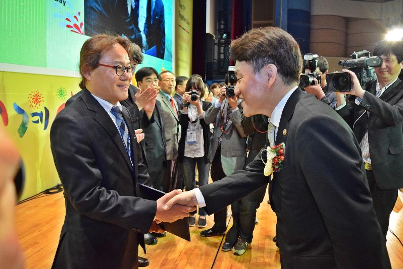 | 손인환 (사)부천이주민지원센터장(왼쪽)이 상을 받고 있다.<사진=부천시청 제공> |