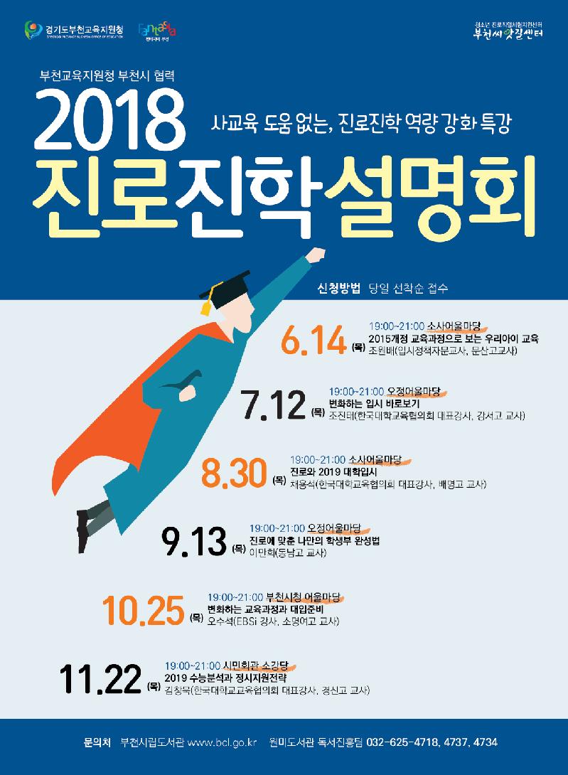부천시와 부천교육지원청에서는 ‘2018 진로진학설명회’를 오는 6월 14일부터 11월 22일까지 총 6회에 걸쳐 진행한다.