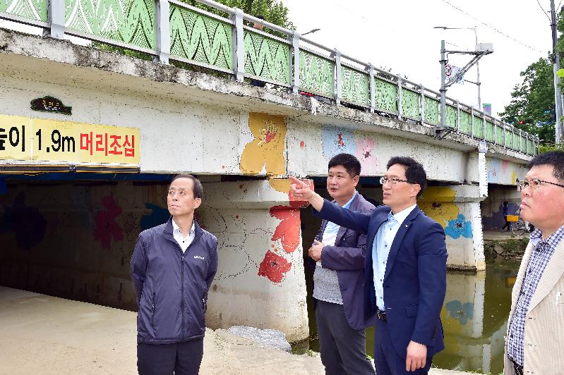 농대교 하부 구조물과 주변 환경을 둘러본 백 부시장은 “농대교 하부에 설치된 우수토실 등 하천 흐름을 가로막는 하수처리시설 철거 작업을 여름이 오기 전에 마무리해 달라”며 “하천 주변 나무와 잡풀, 퇴적물 등 수해를 유발할 수 있는 주변 환경 정비도 서둘러야 할 것”이라고 강조했다.