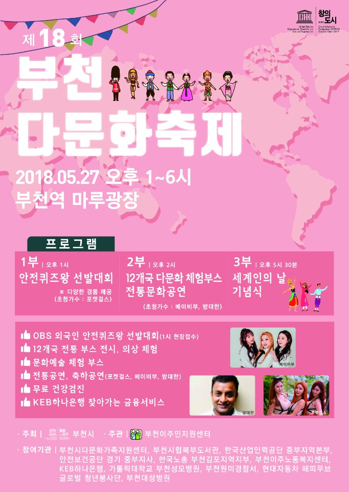 부천시는 세계인의 날(5월 20일)을 기념해 오는 27일(일) 부천마루광장에서‘2018년 부천 다문화축제’를 개최한다.