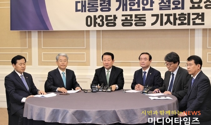 야 3당은 “개헌은 한 정파의 승패를 넘어, 대한민국 전체의 성찰과 혁신 성과가 돼야 한다고 믿는다”며 “이 때문에 여야 각 당은 국회에서 초당적 합의를 이루고, 대한민국의 총의를 모아내기 위해 인내심을 갖고 논의해왔던 것”이라고 말했다.