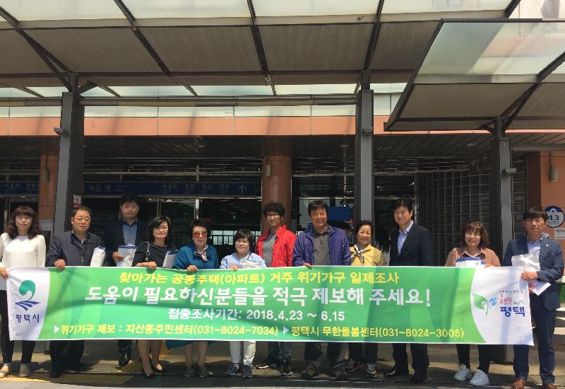 위기가구조사단은 지산동지역사회보장협의체(민간위원장 양기남)를 주축으로 복지통장, 사회복지직공무원 등 28명으로 구성됐으며, 이날 조사단은 송탄역, 공동주택 등을 방문하여 주민들에게 위기가구 일제조사 홍보물을 배부하고, 관리비 체납, 전기·수도 미사용 가구 발견 시 제보를 요청하는 캠페인 활동을 진행했다.