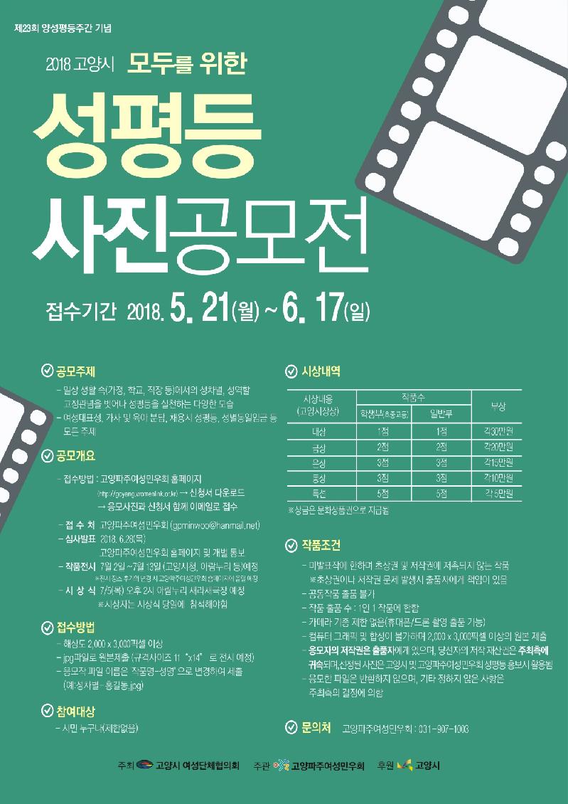 고양시는 양성평등주간(7.1.~7.7.)을 맞이해 양성평등 실천문화를 확산하고자 초·중·고등학생 및 일반인을 대상으로 ‘고양시, 2018 모두를 위한 성평등 사진 공모전’을 개최한다.