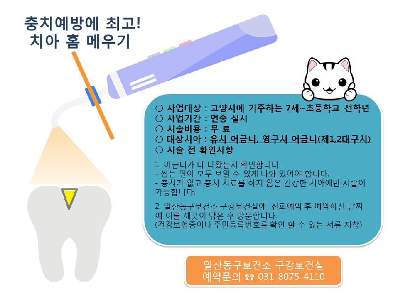 치아 홈 메우기를 원하는 7세 및 초등학생은 전화예약 후 방문해 시술하면 된다. 기타 자세한 사항은 일산동구보건소 구강보건실(☎031-8075-4110)으로 문의하면 된다.