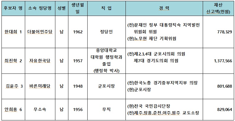 제7회 전국동시지방선거 군포시장 후보자 현황