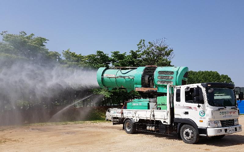 | 광역방제기를 활용한 산림 지역 돌발해충 방제작업. <사진=수원시청 제공> |
