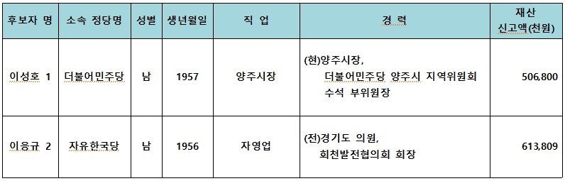 제7회 전국동시지방선거 양주시장 후보자 현황