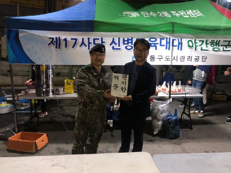 인천 남동구도시관리공단(이사장 김종필)은 2017년부터 현재까지 7회에 걸쳐 신병교육대 훈련병들에게 야간행군 간식제공은 물론, 훈련병들과의 대화를 통해 위로와 격려활동을 실시하고 있다.