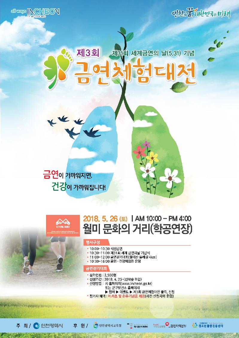 인천광역시는 제31회 세계 금연의 날(5.31)을 맞이하여 흡연의 폐해, 담배의 위해성을 알리기 위해 오는 5월 26일 월미 문화의 거리 학 공연장에서 제3회 금연체험대전을 개최한다고 밝혔다.